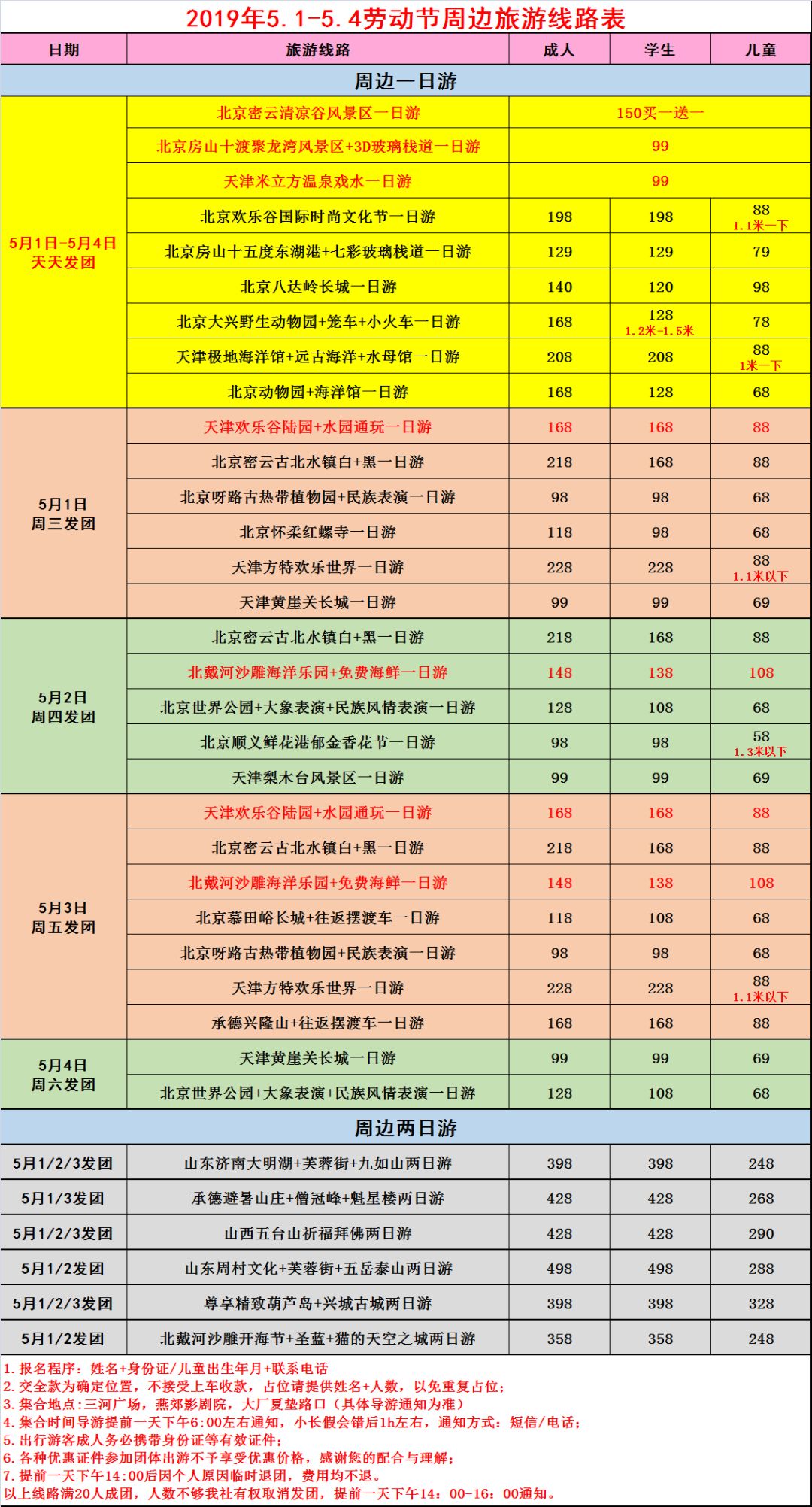 北京周边游线路表格(燕郊发团)