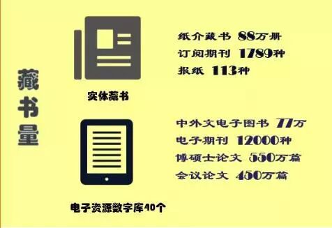馆内订阅各种期刊、报纸。有“40个电子资源数据库,包括77万种中外文电子图书、12000余种电子期刊,550万篇博硕士论文等。