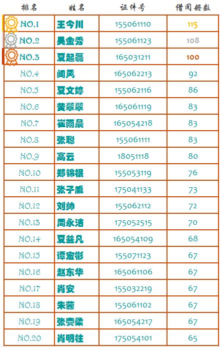 此次龙虎榜收录借阅册数前二十名的同学,他们2018年的借阅册数都在六十五以上,借阅册数前三名的同学借阅册数更是达到了百位。