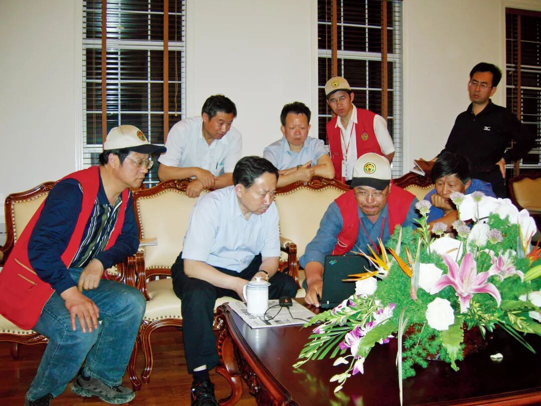 学校专家在汶川地震现场向原教育部部长袁贵仁汇报中小学校舍震害情况