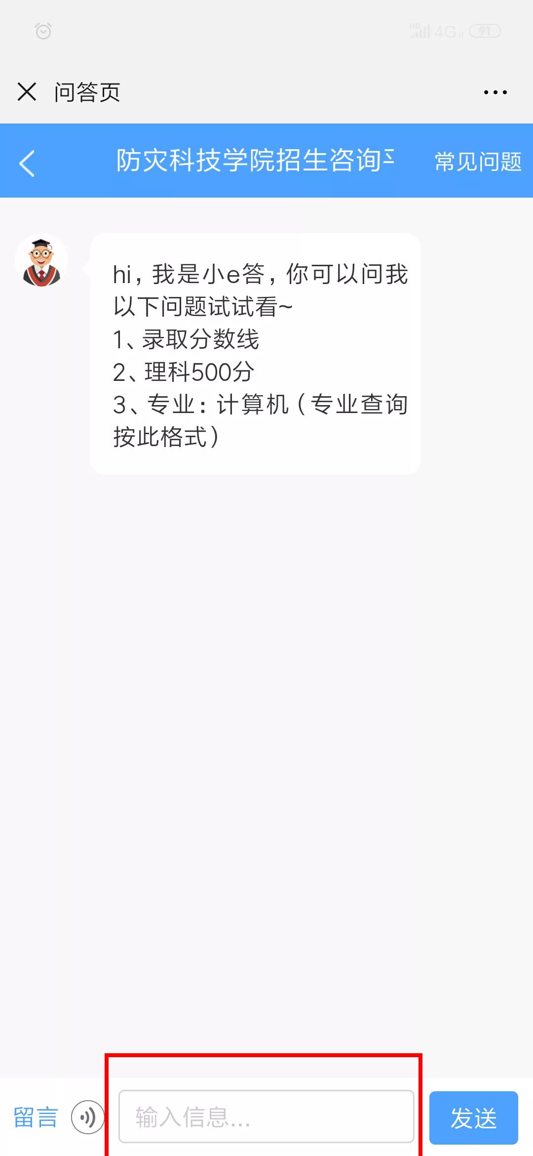 方法一:在微信公众号功能区通过“招生咨询”助手通过输入关键词,如“分数线”“宿舍”“空调”“专业”等进行咨询(如图所示)