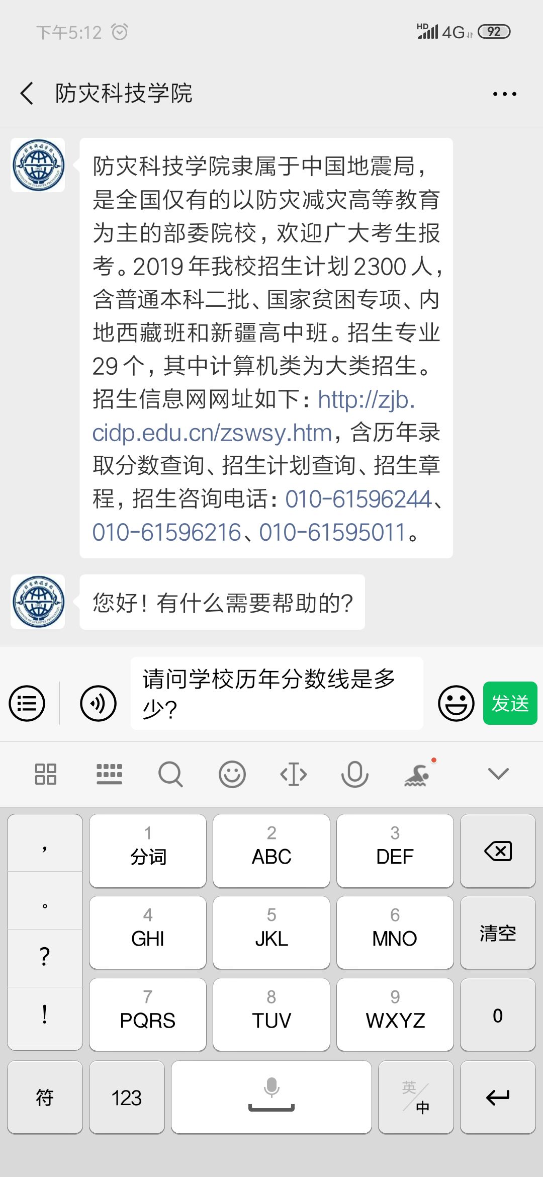 考生以及家长也可以在官方微信公众平台“招生咨询”栏目发送问题或关键词进行咨询: