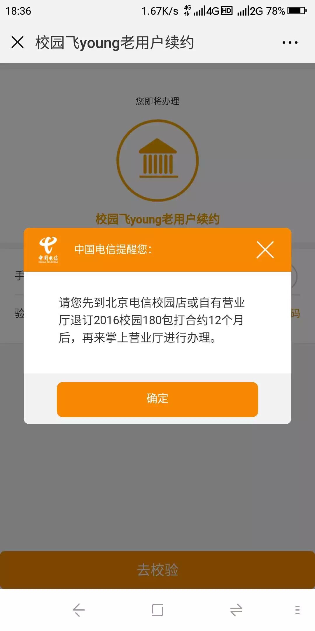 还等什么?续约的小伙伴请在 燕郊高校圈微信公众号回复“电信续约” 扫码回复“电信续约” 即可查看续约链接获取方式 扫码回复“电信续约” 即可查看续约链接获取方式 扫码回复“电信续约” 即可查看续约链接获取方式 如果你的套餐是本月到期 那就下个月一号在续约 不然的话会出现这个对话框哦