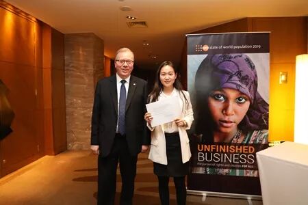 4月11日,由联合国人口基金驻华代表处和中国国家卫生健康委员会人口监测与家庭发展司联合举办的《2019世界人口状况》中英双语报告发布会在北京举行。联合国系统驻华协调员罗世礼、中国国家卫生健康委员会人口监测与家庭发展司司长杨文庄、联合国人口基金驻华代表洪腾等人分别在会上发表讲话。我校文法学院2016级法学专业刘炼与传媒学院2018级播音与主持艺术专业袁阳天作为优秀青年大学生代表在会上发声。本次发布会活动由中国国际电视台主持人成蕾女士主持。