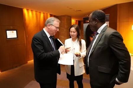 我校两位参会学生代表优秀青年大学生在本次发布会上发声,就大会关注的两性平等问题、青年与未来、世界人口发展、女性权益等问题积极发表意见和看法,代表燕理站在世界前沿展望未来,从燕理走向世界。我校学生刘炼和袁阳天同学受到联合国系统驻华协调员罗世礼先生的亲切接见,同学们与罗世礼先生积极交流,收获颇丰。罗世礼先生还为同学们做了精彩寄语:“可持续发展的目标要涵盖所有人,这意味着要确保每个人都享有权利、机遇和选择”。